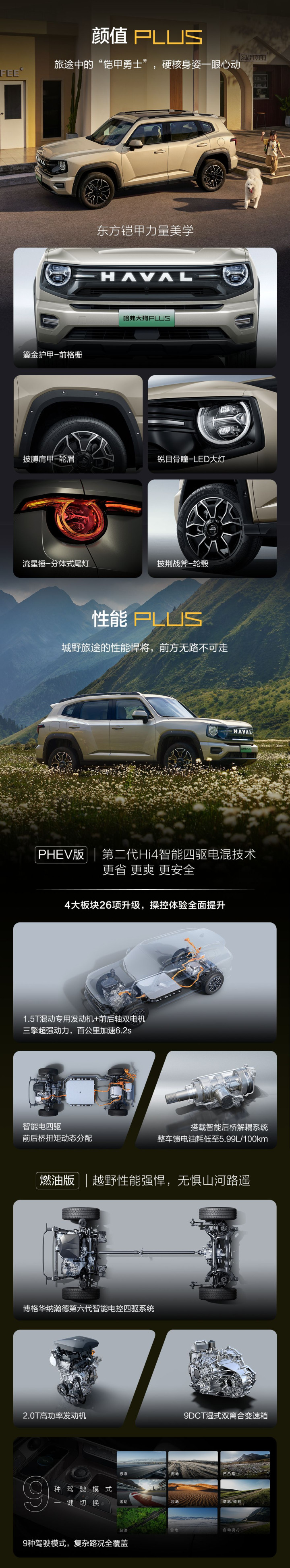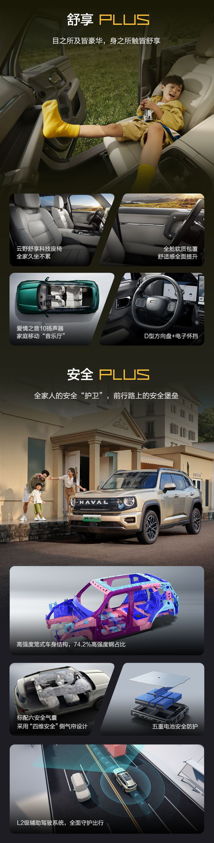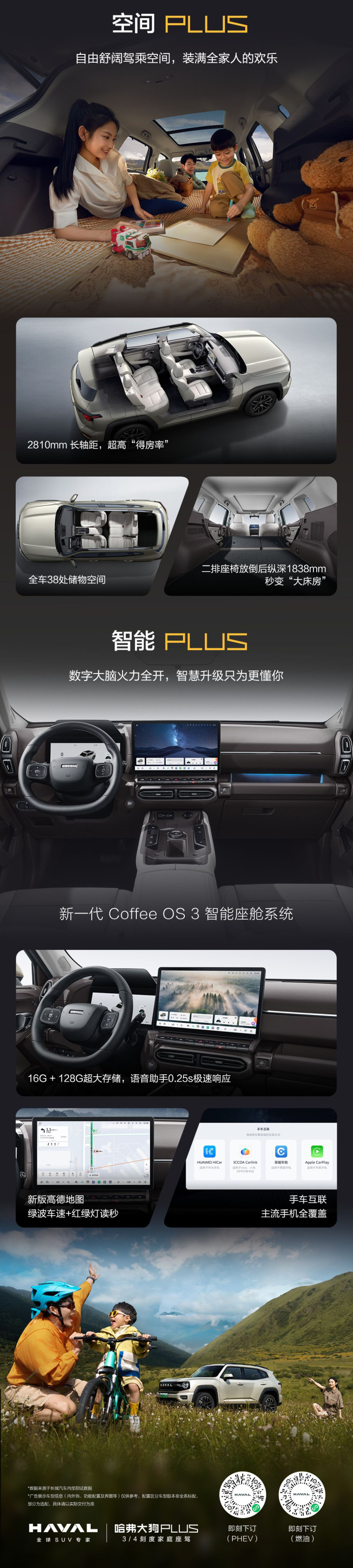 哈弗大狗PLUS不仅延续了经典硬派造型与越野实力,更在空间、舒适及智能配置方面全面升级,致力于为家庭用户提供可城可野的全能出行体验。现在预订,即可尊享多重超前权益,开启你的硬核浪漫家庭之旅!